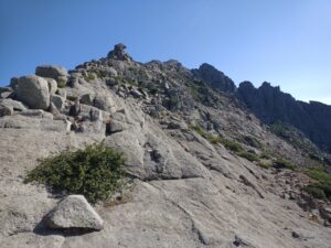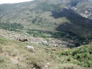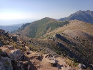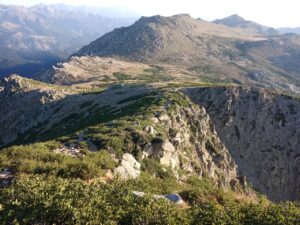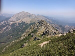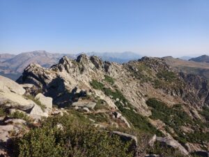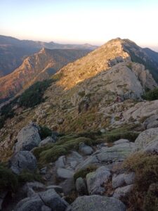 Die heutige Etappe sollte ca. 4,5 Std. ohne Pause dauern. Da ich möglichst wenig in der Hitze wandern möchte, war ich heute wieder gegen 6h auf dem Weg….und gleich erstmal aufsteigen….lief aber ganz gut….Blick zurück runter auf das Refuge…der erste Teil der Etappe war am Grat entlang, mal auf der einen, mal auf der anderen Seite…..mit grandioser Aussicht…einziger Wehrmutstropfen….es gab wieder Kletterpassagen und es ging am steilen Berghang entlang…damit kann ich mich immer noch nicht anfreunden….mit Rucksack und Stöcken teilweise auf allen Vieren klettern….schwer auf solchen Passagen abzuschalten, da ist der einfache Waldweg schon besser für…. dafür hatte man ein weites Panorama…irgendwann musste ich die Stöcke wegpacken…und dann als ich so am schrägen Berghang auf einem kleinen Pfad entlang lief, sah ich voraus eine steile Bergwand …hmm ..da rauf? Wo? Zeichen sah ich auch keine mehr ….Mist….aufs Navi geschaut….so wie es aussah vom Weg abgekommen….ganz genau ist das Navi ja auch nicht, aber sah so aus….als zurück….da kam ein Wanderer entgegen, den ich fragte, wo der Weg verläuft….und ja da war eine Abzweigung zum Grat hoch, wo ich einfach auf dem Pfad geradeaus lief….also korrigiert und weiter … Ich lief und lief…ging heute wieder besser….ich hatte ein Ziel …kurz vor dem Tagesziel, sollte es eine Bergerie geben….ich hoffte auf ein Frühstück….😃. Irgendwann ging es abwärts und die Landschaft änderte sich….auch wunderschön….Dann nach über 3 Stunden Laufzeit nach Start, kam die Bergerie….und tatsächlich bekam ich Frühstück mit Kaffee 😃. Währenddessen waren freilaufende Schweine die nach essen suchten zu Besuch…. wilde, Haus- oder hypride Schweine…auf Korsika kommt alles vor….