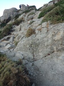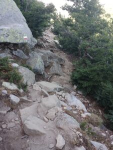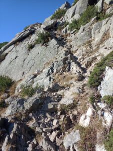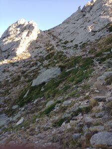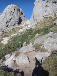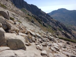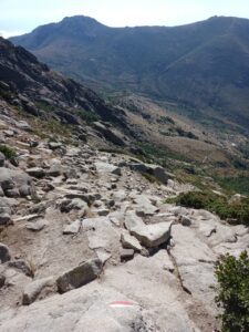 Wanderweg finde ich als Bezeichnung aber eigentlich nicht passend….Route trifft es für mich eher. Der GR20 soll zu den schwierigsten Wanderrouten Europas gehören…das hängt natürlich von vielen Faktoren ab..nicht zuletzt von der eigenen allgemeinen Verfassung…..oft gab es zur Route noch alternative alpine Varianten, auf die ich verzichtete….die alpinen Passagen, die auf der Standard-Route lagen, haben mir bei weitem gereicht 😉. Alpin bedeutet höher…oft dann auch mit Klettereien oder anderen schwierigeren Passagen verbunden und wetteranfälliger…Auf dem GR20 bewegt man sich überwiegend auf Steinen…klein…. groß….sehr groß….und Felsen voran….teilweise kletternd an Berghängen…in Schräglage……über Stein- u. Geröllfelder….auf allen Vieren….geradflächige Wanderpassagen ohne Steine im Weg sind in der Minderheit…gibt es aber schon ….und auch schöne…. für mich waren die ungewohnten Wege eine Herausforderung, da ich ständig schauen musste, wie ich meinen Fuß wohin setze…meine Füße waren oft in Schräglage beim Auftreten, was dann zum Ende hin auch nervig wurde….dann kam auch alles zusammen…die schwierigeren Kletterpassagen waren ebenfalls eine Herausforderung für mich….ich war dann oft so angespannt, dass ich auch gar keine Fotos vorher machen konnte….ich wollte einfach nur durch….😃. Über schräge, abschüssige Felsplatten zu laufen, war auch recht ungewohnt…