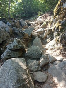 Für mich ging es zum nächsten Gipfel auf 1930 Meter…unter knallender Sonne schon am späten Vormittag…. zwischendurch schattige Plätze zum Abkühlen und verschnaufen genutzt und auch nochmal was gegessen….die Sonne hat mich so schnell aufgeheizt, dass ich immer wieder kleine Pausen einlegen musste….und man denkt, da….ich sehe den Gipfel….aber das ist er nicht …kommt man näher, ist noch einer hintendran…..und hintendran und hintendran….zum verrückt werden….und dann kamen heute auch wieder Kletterpassagen dazu….mit Rucksack mag ich schon nicht so….und dann noch mit den Trekkingstöcken….irgendwann musste ich die dann einfahren, Rucksack aus, einpacken, Rucksack auf….und dann später wieder umgekehrt und hoffen, dass man das Spielchen nicht gleich wieder machen darf….dann endlich…ja…da war er endlich der nächste Gipfel auf 1930 Meter Höhe……aber noch nicht der höchste auf der Etappe…dieser war nochmal 50HM höher…..aber nicht einfach aufwärts gehen….das wäre zu einfach…