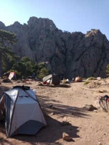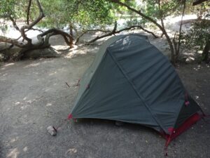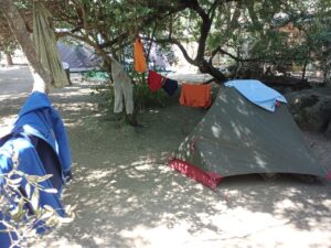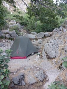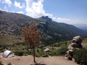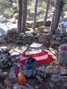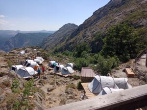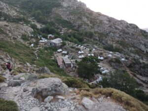 Und dann gegen kurz nach 14h sah ich dann das Endziel, das Refuge….kurz davor gab es noch eine Quelle…ein dünner Strahl Wasser aus einem Schlauch….egal… Hauptsache Wasser….also den Rest aus der Flasche über den Kopf geschüttet und dann wieder aufgefüllt und gleich noch was getrunken….dann weiter zum Refuge geschleppt…viele Menschen und relativ viele Deutsche … Zeltplatz ausgesucht, Zelt aufgebaut und mit der Luftmatratze in den Schatten gelegt und erschöpft eingeschlafen…nach 2 Std. wieder wach geworden…. Für Dinner hatte ich mich nicht eintragen lassen….ich war einfach zu fertig und hatte keine Lust darauf….auch den Weg zur Dusche sparte ich mir…es gab dafür eine einfache Handwäsche….wie ich später gehört habe, gab es eine lange Schlange vor der Dusche…eine Dusche soll mit einer Holzumzäunung sein, die andere ist frei und auf einer Europalette, so dass da wohl jeder zusehen kann, der da in der Schlange steht…. würde ich mir ja gerne mal anschauen, aber ich bin zu faul dort hinzulaufen….gehe heute nur nochmal Wasser auffüllen und dann schlafen….heute Abend gab es auch Elch zum Essen …der hat eine weite Reise hinter sich…von Estland nach Deutschland und dann nach Korsika….war meine Notreserve….aber da morgen die letzte Etappe ist und ich mein Proviant weitgehend aufbrauchen möchte, musste das Trockenfleisch heute dran glauben….und es war lecker…danke Triin 😃.