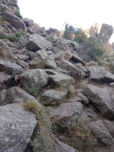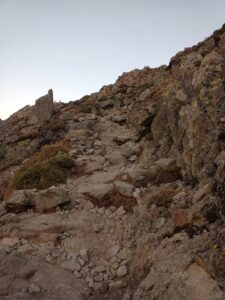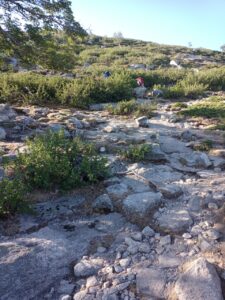 Anschließend ging es weiter über schattenlose Hochebenen und Hügel, bis es dann wieder galt, über Steine und Felsbrocken, sich auf über 2000 Meter hochzuarbeiten bzw. zu schleppen….hat sich aber gelohnt – hier gab es wenigstens wieder Internetempfang 😁😃. Von oben sah ich schon das Ziel… schön….und nicht schön, wenn man den ungefähren Weg sah 😉.