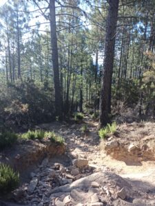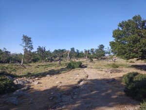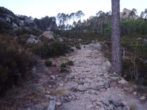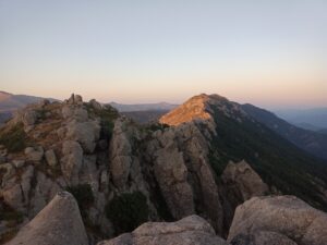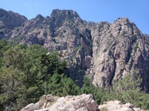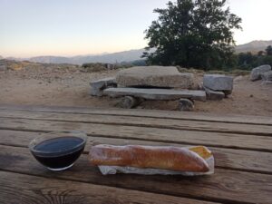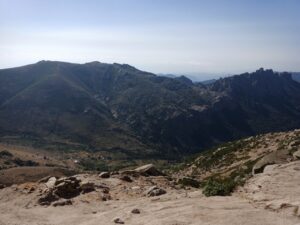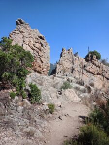 Kurz war die Nacht….etwas über 13km standen heute auf dem Programm….los ging es um 05.30h…. erstmal überwiegend runter…..Dann stand ein steiler Anstieg auf 1035m an ….der höchste Gipfel auf der letzten Etappe…und der Anstieg hatte es wieder voll in sich …naja…..ich redete es mir schön….der letzte Gipfel….auch wenn schon vor 7h mir der Schweiß aus allen Poren schoss….nach 7h war ich dann oben…toll …freu…..aber freu dich nicht so früh….wie ich später merkte….das Ziel lag auf 230HM….also geht es runter…..aber nicht einfach geradlinig….sonst wäre es nicht der GR20…der restliche Weg verlief immer wieder ab- und aufsteigend…. Es gab immer wieder mal einen Gipfel, der unbedingt noch auf dem Weg liegen musste….um 10h war die Hitze unerträglich und ich habe alles Mögliche beschimpft 😁😀…. mittlerweile habe ich mich wieder abreagiert..  aber der Weg machte es mir bis kurz vor dem Ziel Conca nicht leicht…als ich die Häuser sah, freute ich mich schon sehr… Irgendwann kurz vor der Ortschaft, kam eine Quelle….super …Kopf drunter, abkühlen und Durst löschen….dann ging es etwas durch den Ort zum Endziel, der Bar Le Soleil. Da war es ca. 11h.