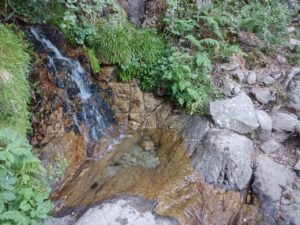 Unterwegs musste ich Wasser an einem Gebirgsbach nachfüllen, nachdem ich merkte, dass das Wasser aus einer meiner Flasche merkwürdig roch. Die Strecke zog sich enorm….ich hatte das Gefühl, heute wird es mir besonders schwer gemacht….meine Stimmung sank merklich…es war einfach hart für mich heute…sich über die Wege, auf denen man sich teilweise wieder nur auf Steinen balancierend und stolpernd fortbewegen konnte, immer wieder rauf und runter zu schleppen und ab 10h knallte die Sonne, wo kein Schatten war unbarmherzig herunter und machte es noch schwerer den Rucksack oft mit großen Schritten die Pfade auf- und abzusteigen…..dann folgte ich einem Pfad quer über den Berghang, sah aber plötzlich keine Farbmarkierungen mehr, sondern vereinzelt nur Steinmännchen…das Navi zeigte mir dann, dass ich mich abseits und unterhalb des GR20 befand….also gerade aufwärts den Hang zum richtigen Weg hoch geschleppt….gegen kurz nach 11h kam ich dann am einem Ausflugsziel an…viele Autos….Menschen…und ein sehr kleiner Ort….ich sah ein Schild mit Pizzeria drauf und bin direkt dort hin…als ich mich hinsetzen wollte, sagte man mir, dass es erst ab 12h Essen gibt….also bin ich weiter zum zweiten Restaurant…dort genau das gleiche Spiel….dann steuerte ich genervt den Snack- Laden auf der anderen Straßenseite an und bestellte dann eben ein Panini und anschließend Crepes. Wie ich später von einem anderen Wanderer erfuhr, gab es im ersten Restaurant, wo ich nur davor stand aber wieder weiter ging, um die Uhrzeit schon Mittagessen….. Pech….der Ort ist an sehr imposanten Bergen gelegen….auf den Fotos kann man das nicht so gut erkennen….nur zu viele Autos für mich….