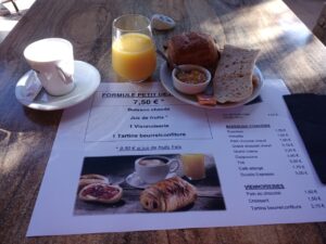 Heute Nacht hat sich die Kälte und Feuchte im Tal gesammelt….das habe ich gemerkt….habe mit Buff und Mütze geschlafen und bin auch dick gepackt gegen 05.30h los gelaufen…. Handschuhe haben noch gefehlt..es ging los mit geringem Anstieg …nach ca. 45 Minuten hat man schon deutlich den Temperaturunterschied spüren können….und nach 1 Std. konnte ich schon Jacke ausziehen und Ärmel hochkrempeln… Das war die Zeit, als ich im nahegelegenen Refuge ankam…der Plan „Frühstück“ ging auf….der Wirt war schon da und bediente seine Gäste….ich habe dort 2 Kaffee genommen und mein Picknick, ein Baguette, gegessen….