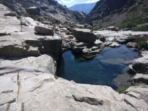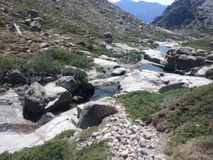 Los ging es heute erst nach 6h und insgesamt auf eine, in Bezug auf die letzten Tage, angenehme Tagestour, teilweise durch Wald, vorbei an zahlreichen Bade-Gumpen, das sind Bade-Löcher (also Triin, hier sind deine Pools) in den Gebirgsbächen. Die angenehmste und auf ihre Art schönste Etappe bisher. Momentan gibt es hier ein Ultra Trail Run Wettbewerb….viele Läufer, die hier einen Teil des GR20 in ein paar Tagen rennen. Mein Picknick habe ich heute Abend gegessen, da ich ein umfangreiches Frühstück hatte und wir nachmittags nochmal eingekehrt waren und ich Kuchen hatte 😀. So, jetzt geht’s ins Bettchen….
