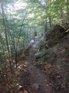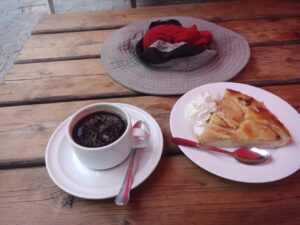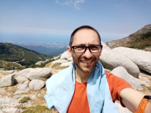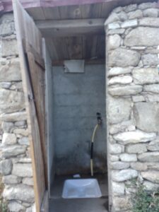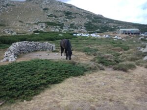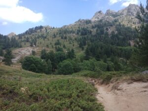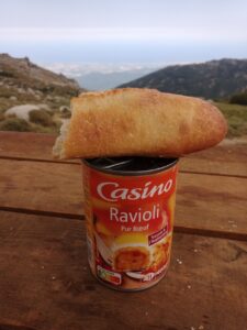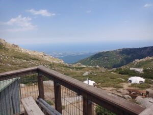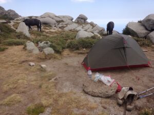 Insgesamt war die Tour viel durch schattigen Wald…und schöne Landschaft….wieder sehr zu genießen…bis auf die Anstrengungen 😉. Rucksackgewicht ging heute einigermaßen…keine großen Probleme…. insgesamt bin ich gut durchgekommen…sogar auf dem letzten Steilstück….lag vielleicht auch am Wetter…war bewölkt….und Verschnaufpausen mussten natürlich auch sein… und natürlich eine größere Pause mit Stärkung am Refuge davor….mit Kaffee und Kuchen 😉….dabei habe ich natürlich nur an den Zuckerbedarf gedacht für das letzte Stück 😉. Höchster Punkt der Etappe war über 1800 HM…und da konnte ich auch wieder das Meer sehen bzw gut erkennen….Am Tagesziel angekommen, geduscht…. wieder mal kalt…brrrr….Zelt aufgebaut und eine Dose Ravioli vernascht….mein Zelt steht abseits der meisten anderen…quasi mit Meerblick und mit Pferden bzw. Mulis vor der Tür 😀…abends ist wieder Menü im Refuge angesagt…das Häuschen auf dem Foto ist übrigens die Toilette 😀